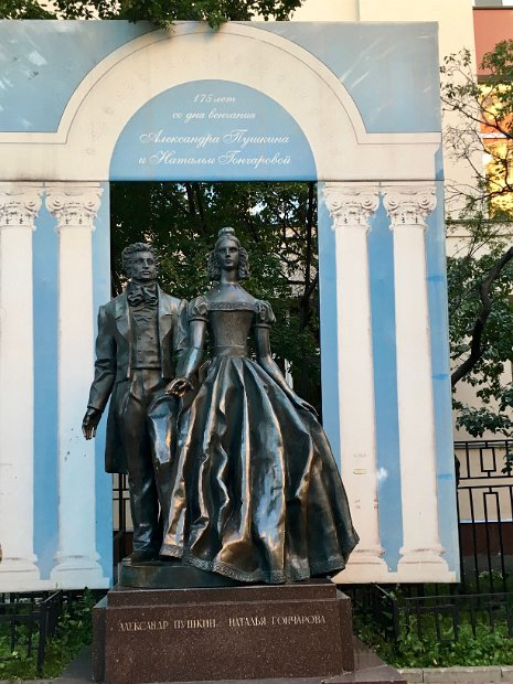 En face, la statue d'Alexandre Pouchkine et Natalia Gontcharova. Ils se sont mariés en 1831. C'est pour elle ou plutôt à cause d'elle qu'il meurt dans un duel avec un officier français en 1837.